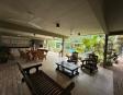 Living diario al aire libre con ventiladores de techo.
