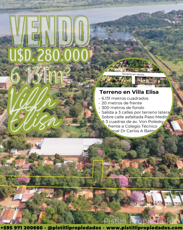 GRAN PROPIEDAD PARA INVERSIÓN VILLA ELISA con una excelente ubicación, con salida a 3 calles por terreno lateral, sobre calle asfaltada Paso Medín a 300 metros de la Avda. Von Polesky, frente al Colegio Técnico Nacional Dr. Carlos A. Balmelli, ideal para desarrollo industral, comercial ó inmobiliario.