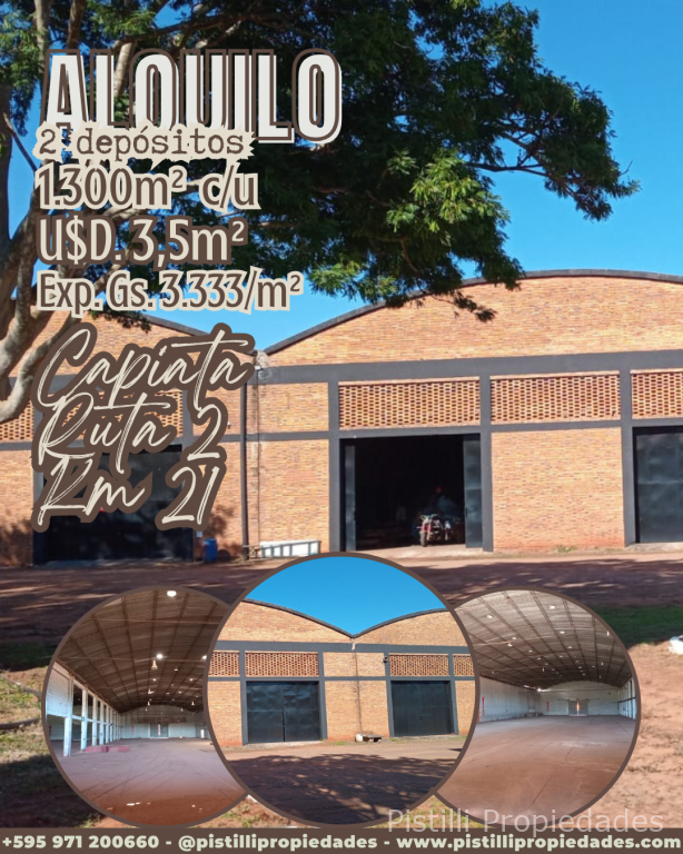 ALQUILO AMPLIOS DEPÓSITOS CAPIATÁ RUTA 2 KM. 21 ¿Buscás el lugar perfecto para potenciar tu logística y almacenamiento? Te ofrecemos 2 depósitos de 1.300 m² en alquiler, estratégicamente ubicado sobre la Ruta PY02, en el Km 21. Esta es la ubicación ideal para tu negocio en Paraguay, garantizando accesibilidad y visibilidad. Este depósito está situado en un punto clave, a solo unos minutos de Asunción y con conexión directa a las principales ciudades del país. La Ruta PY02 es la arteria más importante para el comercio y la industria, asegurando un flujo constante de vehículos y una logística optimizada para la distribución de tus productos.
