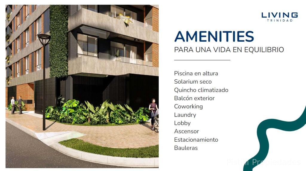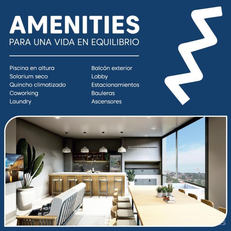 Amenities Premium: Piscina en altura con solárium, quincho climatizado, espacio de coworking, lavandería (laundry), lobby elegante y generador para áreas comunes.