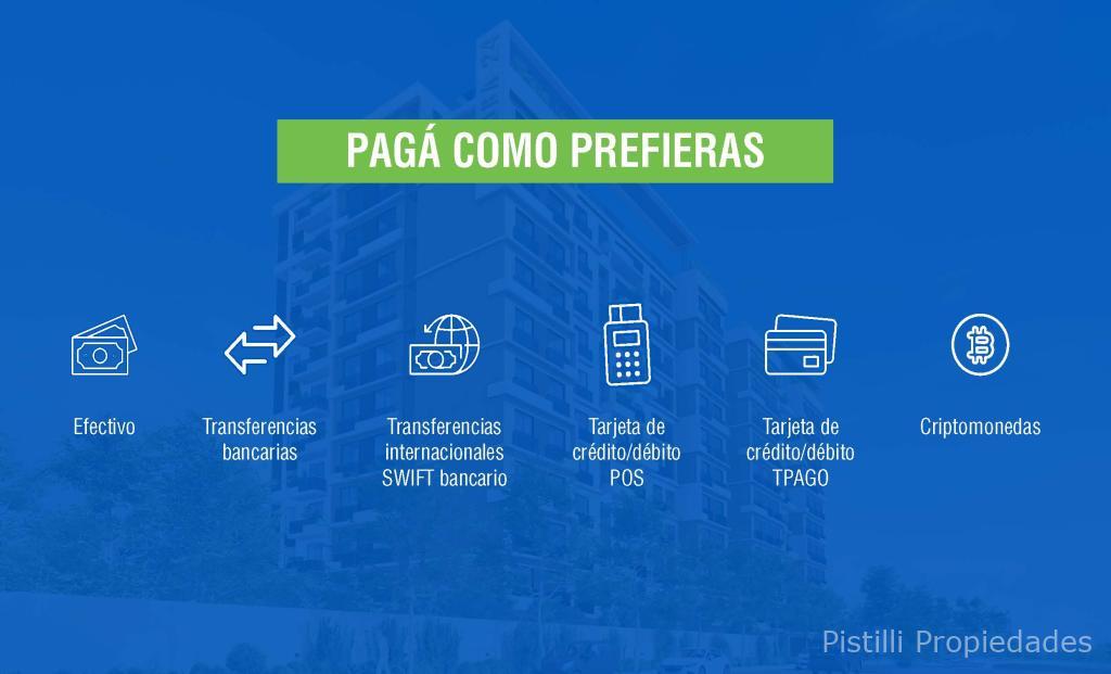 Opciones de pago flexibles: financiación propia hasta 5 años, bancaria, durante obra sin intereses, además de pagos con tarjeta, transferencias y criptomonedas.